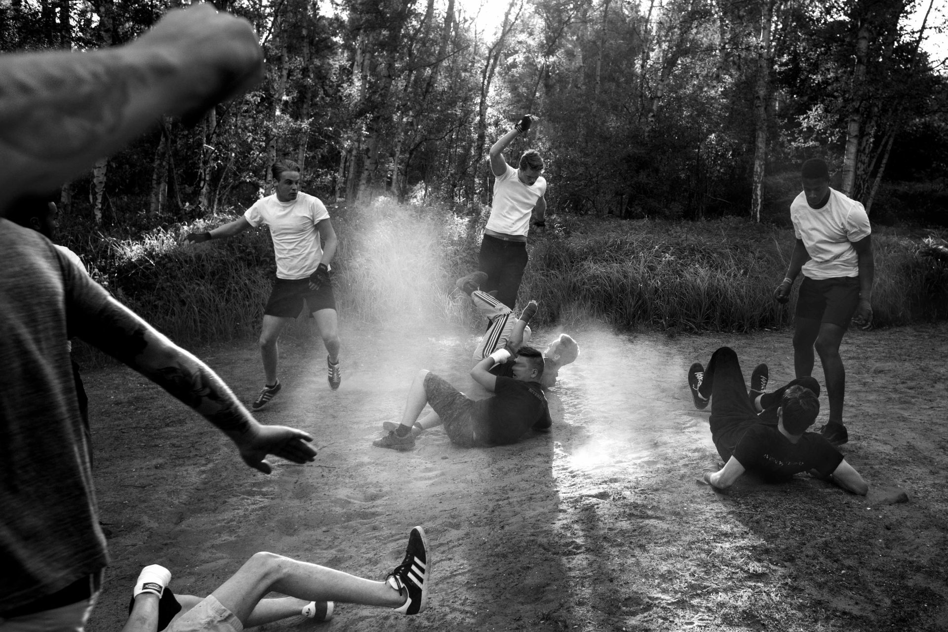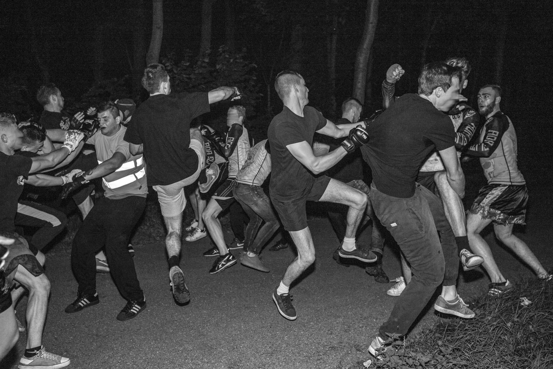 “In 2016, I gained access to an underground scene of illegal “free fights” between rival football hooligan groups. These fights take place deep in forests, far from public view. The rules are minimal: two groups fight for the colours of their club until one side can no longer continue. The confrontations are short, intense, and extremely violent – yet once the fight ends, the aggression dissolves. Hands are shaken, beers are shared, and everyone returns to everyday life.