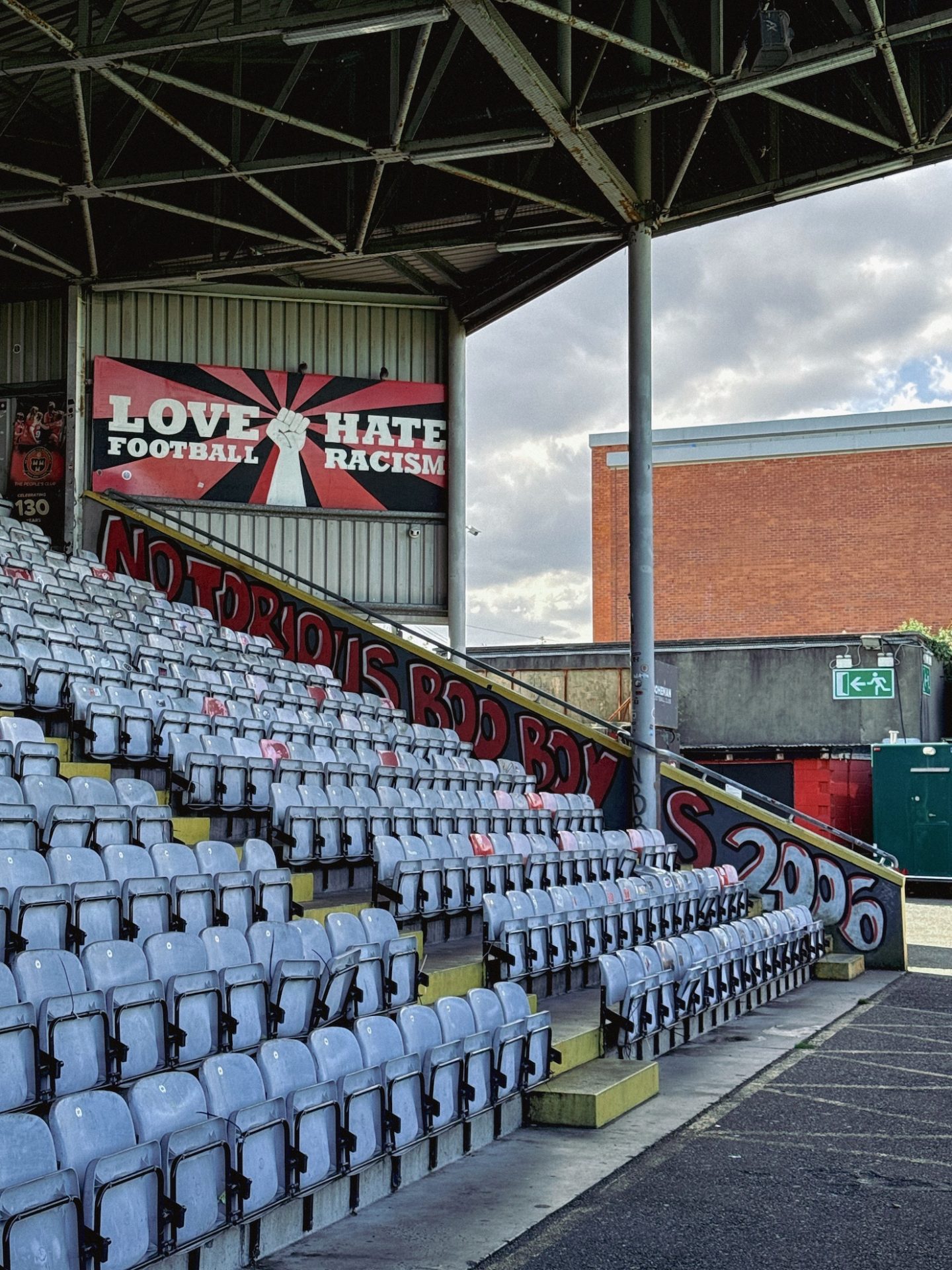Three disparate stands remain in use, but it is the Tramway End in the east that draws the most attention, with its vast, abandoned terrace. One can easily imagine it overflowing on a derby night against Rovers, chants cascading step by step toward the pitch. The Jodi Stand, originally a wooden grandstand conceived and designed by the venerable Archibald Leitch, has a classic look with its roof and single-tier seating, though several elements catch the eye: the sarcastic “Visit Palestine” advertising board, the “LOVE FOOTBALL – HATE RACISM” sign, and stickers calling for Israel’s suspension from UEFA competitions. To the west, the Shed End combines terrace and seating, while to the north, the tiny Mono Stand shelters away fans ahead of the stadium’s future demolition.