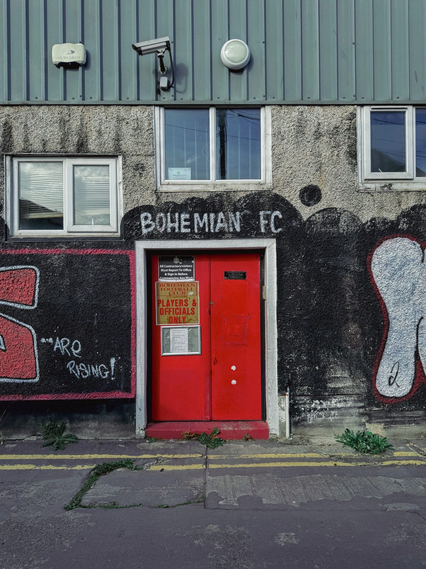 Shot away from matchday and free of crowds, these photographs focus on the fabric of the place: stadium architecture, weathered entrances, surrounding streets, murals, and graffiti that collectively express the identity of Bohemian Football Club and its community. From the wrought-iron gates of the Jodi Stand to the narrow lanes and painted walls that frame the ground, each image captures how football culture lives beyond the pitch. Calm, observational, and rooted in place, this visual essay documents Dalymount Park as it stands today – historic, imperfect, and deeply woven into Dublin’s urban landscape.