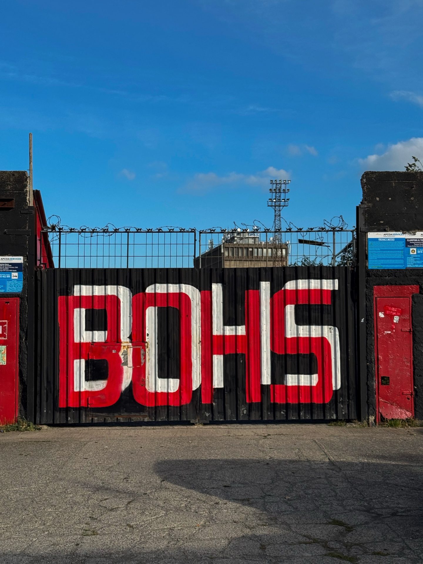 Overlooked by St. Peter’s Church and nestled within the rapidly changing Phibsboro neighbourhood, Dalymount Park has so far defied both time and a predicted demise in the mid-2000s. Still going strong, though showing signs of wear in places, Dalymount remains the beating heart of local social life. Each route leading to the stadium has its own character, but the most famous is undoubtedly the alleyway separating 1 Dalymount and 329 North Circular Road. Upon entering, the walls are painted a vibrant red and adorned with images of former Bohs legends. Just a few dozen metres further on, the iconic central entrance to the Jodi Stand comes into sharp focus. Topped with a wrought-iron sign reading “BOHEMIAN FOOTBALL CLUB – FOUNDED 1890”, it immediately sets the tone with the mural “LOVE FOOTBALL – HATE RACISM”. Almost the entire identity of the Bohemians is encapsulated here: a historic, popular, and activist institution.