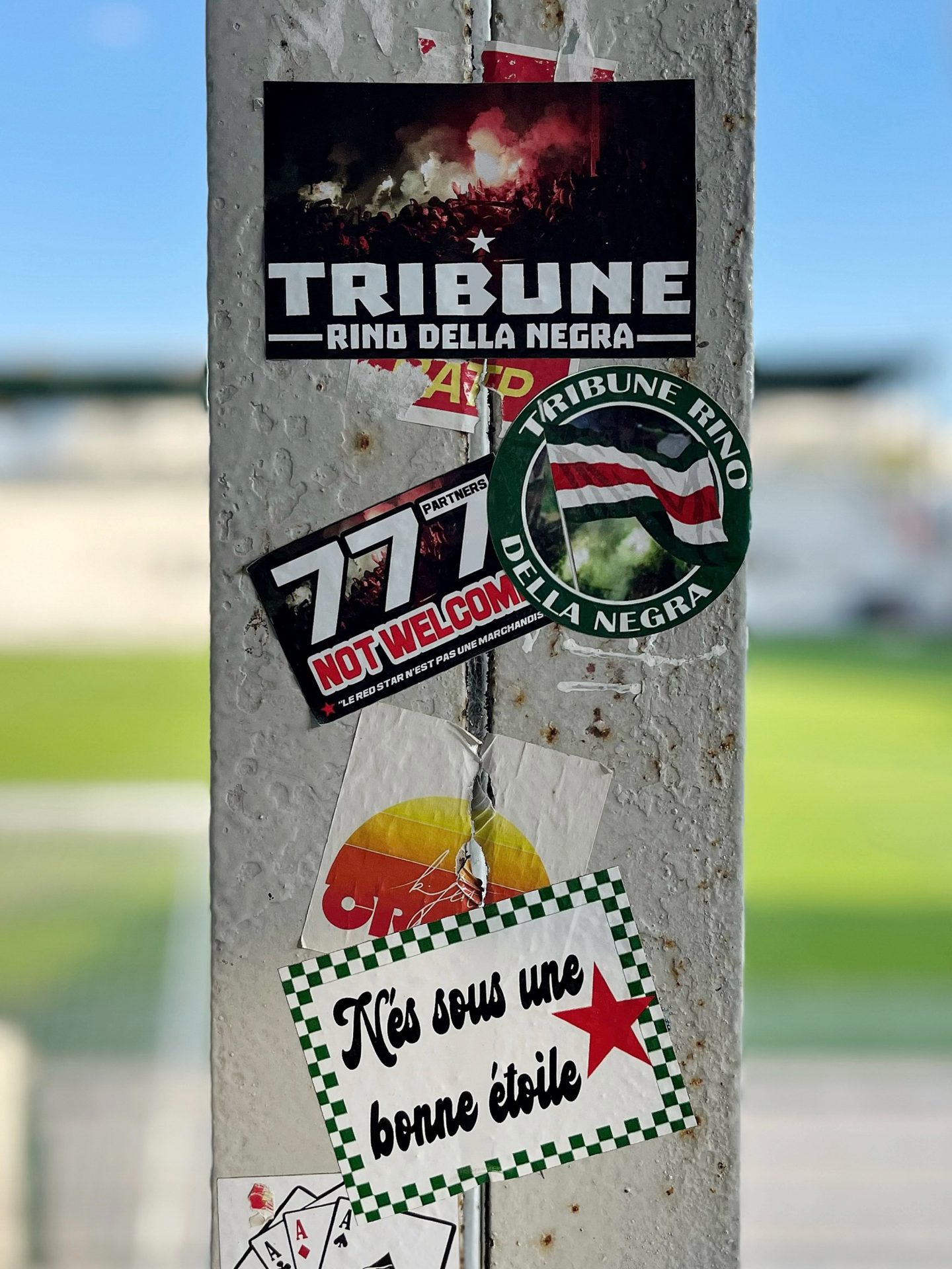 However, one practice has persisted through the ages. When another ultra group’s sticker is already present, the custom is not to tear it off but to add another sticker over it. There is, however, an important distinction. When adding another sticker, it’s best to leave a trace of the original sticker to preserve its history and show which ultra group came next. Stickers can also serve other purposes: criticising club management, denouncing multi-club ownership model, vilifying the police, or promoting friendship with other ultra groups. Sticker sales by ultra groups often contribute to financing their activities, and even to covering the legal fees of banned fans.