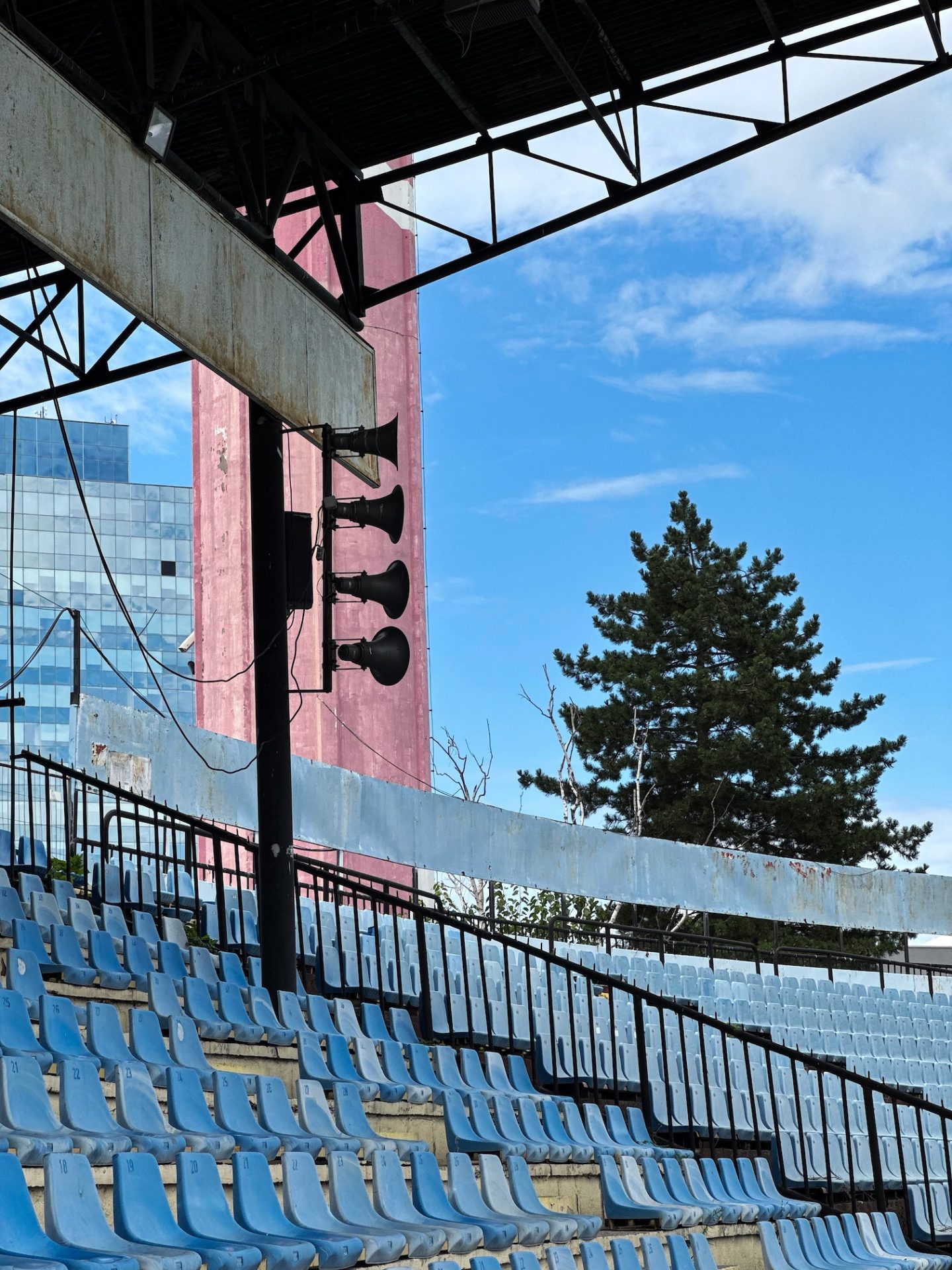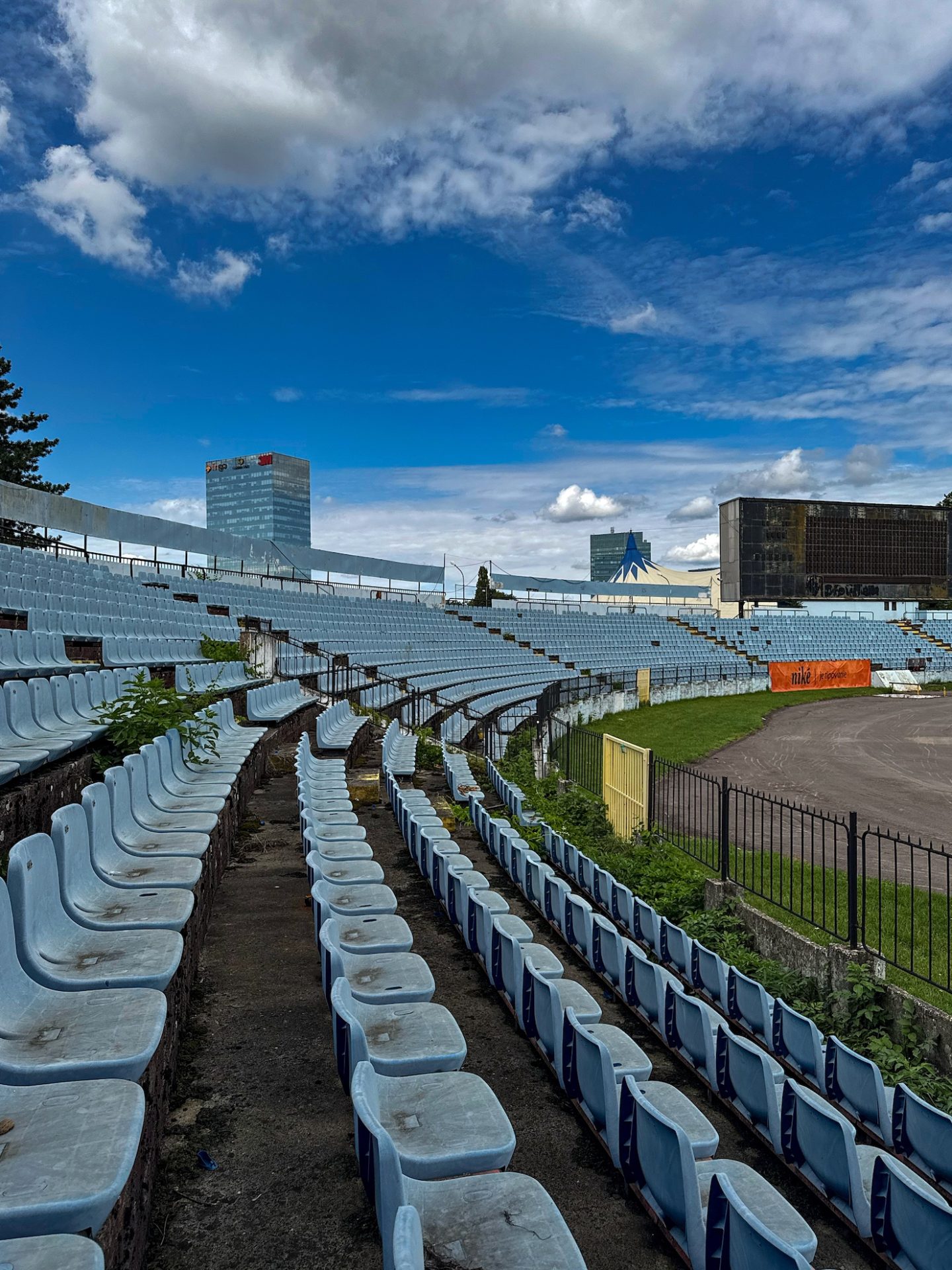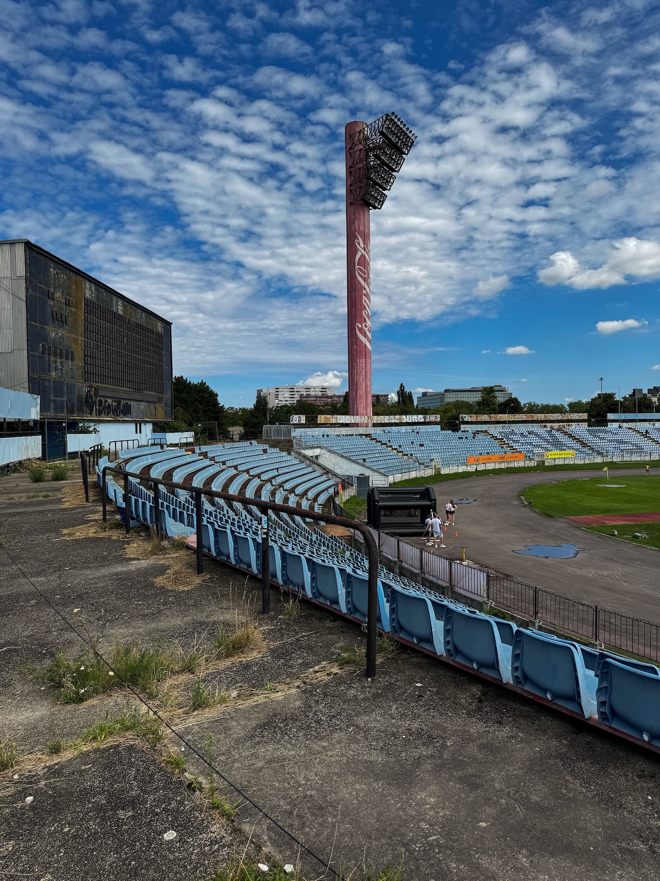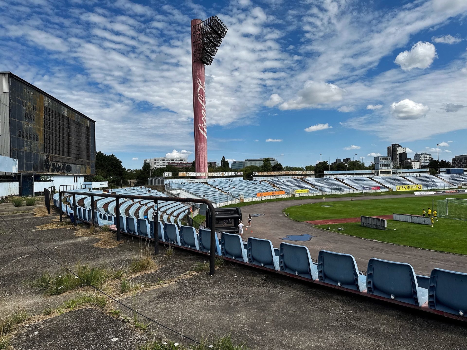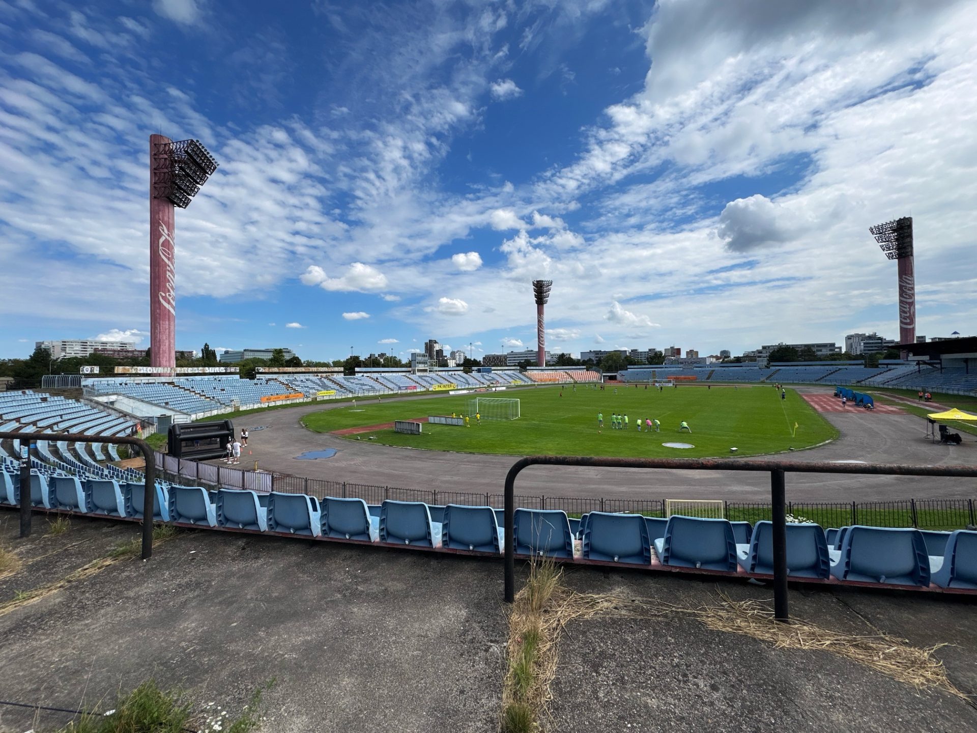 And where does Štadión Pasienky fit into all this? Over the years it has hosted MFK Petržalka, ŠK Slovan Bratislava, and the national team during the reconstruction of Tehelné Pole. This nine-year period transformed the stadium’s identity: the yellow-and-black seats and Inter Bratislava–coloured floodlights gave way to sky-blue seats and Coca-Cola–branded lights. During this time, Slovan ultras also partially boycotted their rivals’ ground.