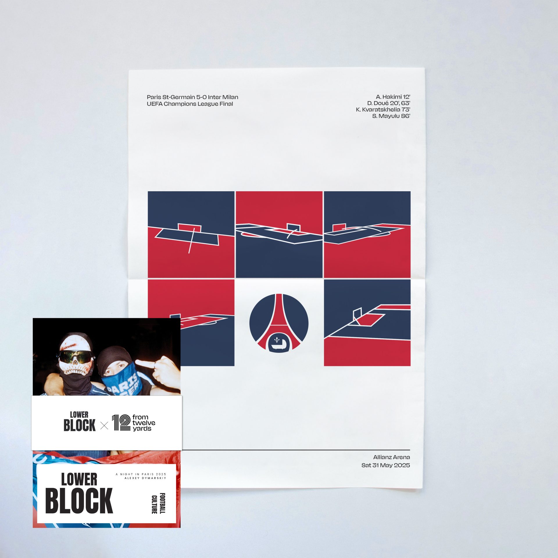 Lower Block x From 12 Yards presents the PSG Bundle, featuring A Night in Paris, a photo zine by Alexey Dymarskiy, and an A3 graphic design poster print by From 12 Yards illustrating PSG’s goals in their 5–0 Champions League final victory over Inter Milan. Full spec below.