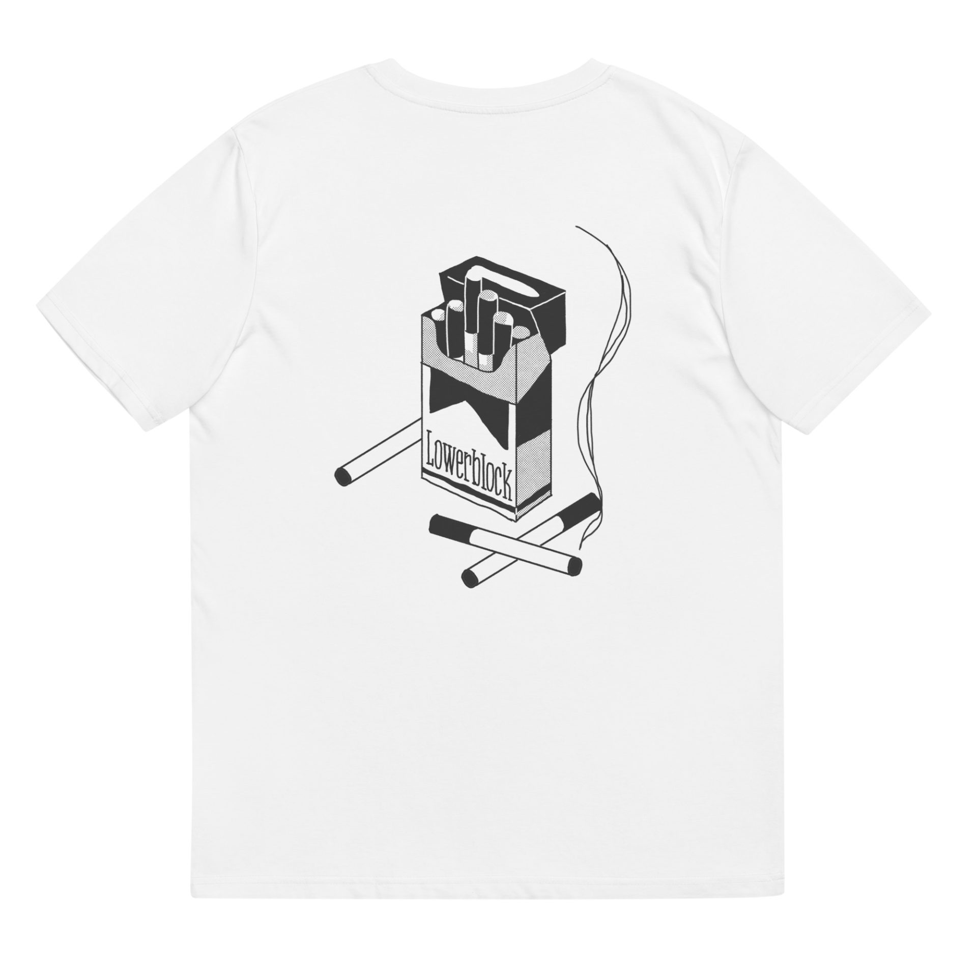 A nod to the 90s – Lower Block Fag Packet T-Shirt. White, Ribbed neck, Organic cotton, regular fit, T-Shirt.
